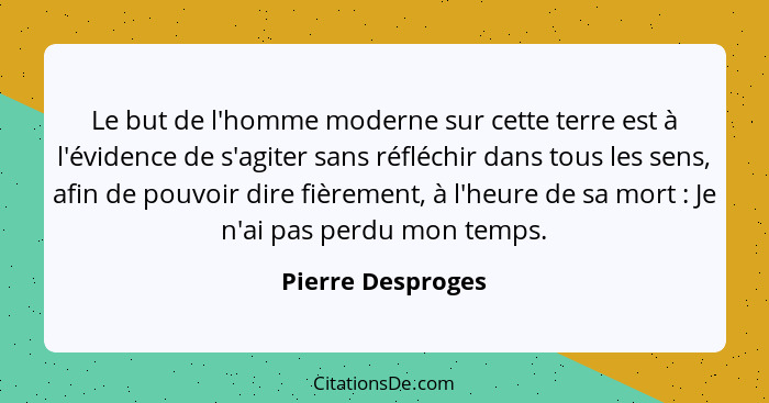 Le but de l'homme moderne sur cette terre est à l'évidence de s'agiter sans réfléchir dans tous les sens, afin de pouvoir dire fièrement, à l'heure de sa mort : Je n'ai pas perdu mon temps.