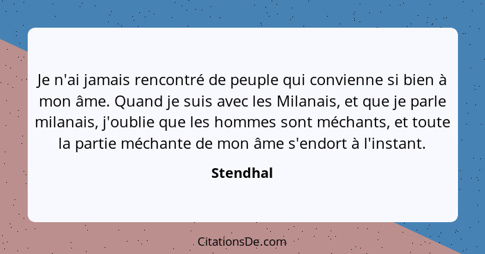 Je n'ai jamais rencontré de peuple qui convienne si bien à mon âme. Quand je suis avec les Milanais, et que je parle milanais, j'oublie que les hommes sont méchants, et toute la partie méchante de mon âme s'endort à l'instant.