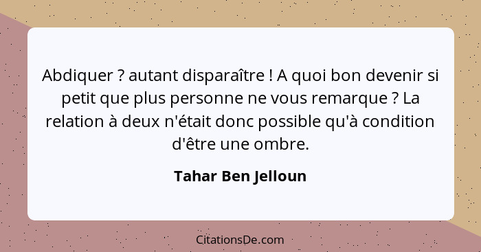 Abdiquer ? autant disparaître ! A quoi bon devenir si petit que plus personne ne vous remarque ? La relation à deux n'était donc possible qu'à condition d'être une ombre.