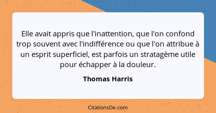 Elle avait appris que l'inattention, que l'on confond trop souvent avec l'indifférence ou que l'on attribue à un esprit superficiel, est parfois un stratagème utile pour échapper à la douleur.