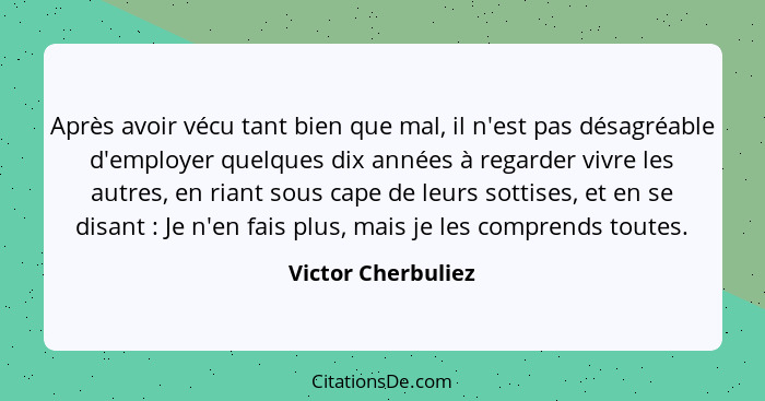 Après avoir vécu tant bien que mal, il n'est pas désagréable d'employer quelques dix années à regarder vivre les autres, en riant sous cape de leurs sottises, et en se disant : Je n'en fais plus, mais je les comprends toutes.