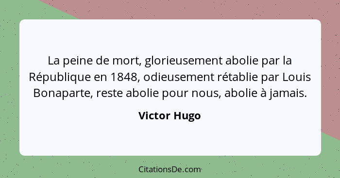 La peine de mort, glorieusement abolie par la République en 1848, odieusement rétablie par Louis Bonaparte, reste abolie pour nous, abolie à jamais.