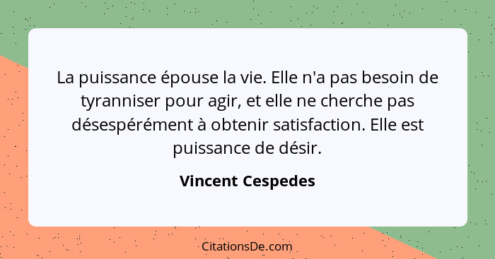La puissance épouse la vie. Elle n'a pas besoin de tyranniser pour agir, et elle ne cherche pas désespérément à obtenir satisfaction. Elle est puissance de désir.