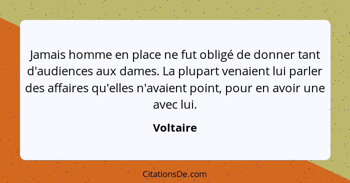 Jamais homme en place ne fut obligé de donner tant d'audiences aux dames. La plupart venaient lui parler des affaires qu'elles n'avaient point, pour en avoir une avec lui.