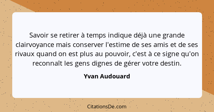 Savoir se retirer à temps indique déjà une grande clairvoyance mais conserver l'estime de ses amis et de ses rivaux quand on est plus au pouvoir, c'est à ce signe qu'on reconnaît les gens dignes de gérer votre destin.